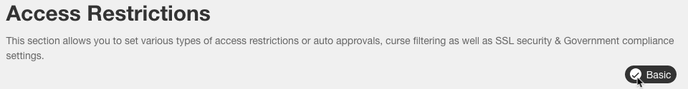 This section provides community administrators with the capability to implement a range of access restrictions, manage auto-approvals, enable curse filtering, ensure SSL security, and adhere to government compliance standards. It is separated into 2 major toggle sections: