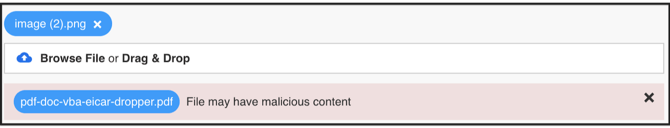 In case there is malicious content, virus or malware during the upload it will show an error and the upload will fail.