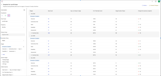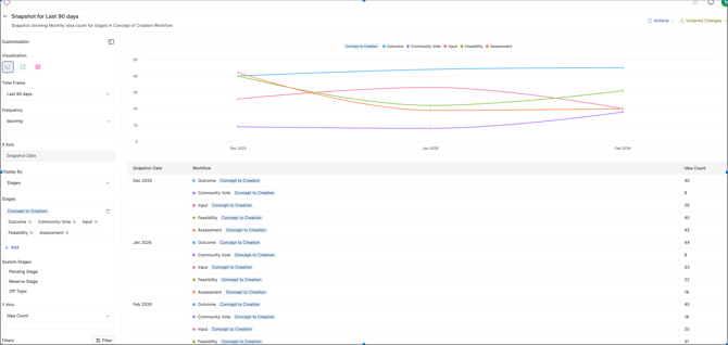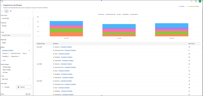 Innovation teams track how ideas move through workflow stages — but until now, that view has always been a snapshot of right now. If you wanted to know how your pipeline looked three months ago, or whether a bottleneck in the Review stage has gotten better or worse over the last quarter, you had to piece it together manually.